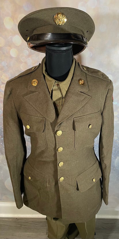 This set is complete with brass “U.S.” and branch collar discs, eagle-embossed buttons, and original WWII tailoring. The wool fabric is well-preserved for its age, with expected light wear but no major damage, making it both collectible and display-ready. Together, the jacket, trousers, shirt, and caps create an authentic representation of a WWII American soldier’s dress uniform, offering a rare opportunity to own a unified grouping rather than individual pieces.