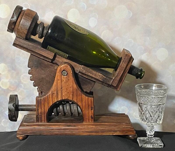 This antique wooden wine bottle tilter is a remarkable example of both ingenuity and craftsmanship. Built with a gear-and-crank mechanism, it allows a bottle to be held securely and tilted for a smooth, controlled pour. The design not only made serving easier but also prevented sediment from disturbing the wine, a necessity in the days before modern filtration and decanting tools. The warm patina of the wood highlights its age and authenticity, making it a standout piece for display.