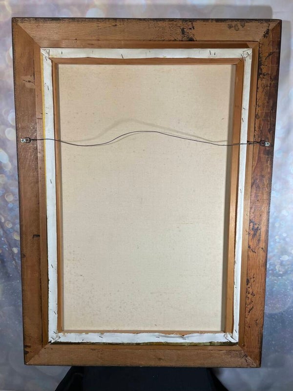 This vintage oil painting by J. Engel captures a sailboat resting in golden waters beneath a glowing sunset sky. Warm amber tones spread across the horizon, their reflections dancing on the water, while seagulls glide gracefully overhead. Engel’s brushwork blends soft gradients with textured detail, bringing depth to the shoreline and atmosphere to the scene. The piece is set in its original gilt frame, which shows gentle wear consistent with age, adding to its authentic vintage character.