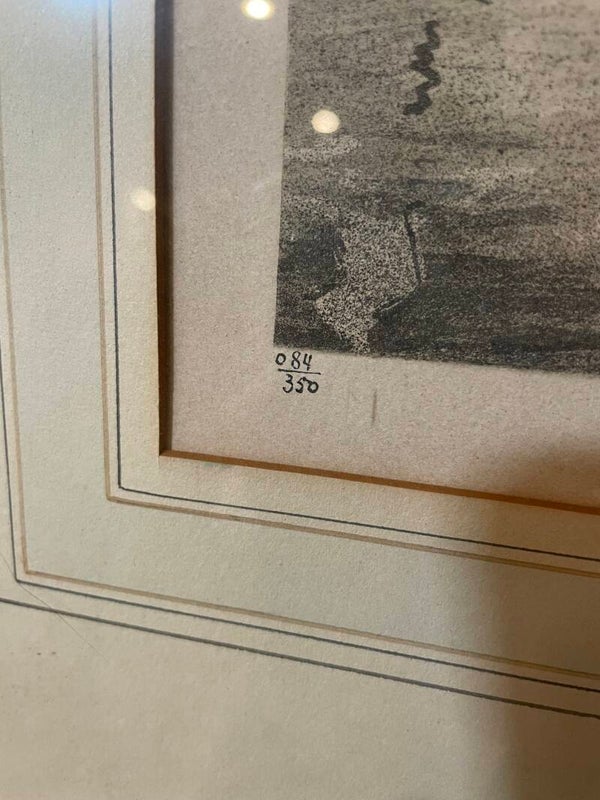 The work is hand-signed in pencil by Grelot and marked 89/350, confirming it as part of a limited edition series. Measuring 29 ½” x 25” in its original frame, the piece retains its aged backing paper and hardboard mount, which testify to its vintage origins and add authentic period character.