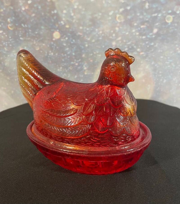 Popular among glassmakers from the mid-20th century, amberina hen dishes are prized for their bold coloration and eye-catching display appeal. This example remains a beautiful decorative piece, ideal for collectors of vintage glass, farmhouse décor, or unique kitchen accents.