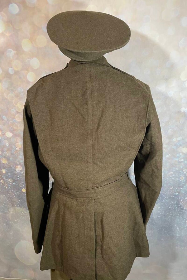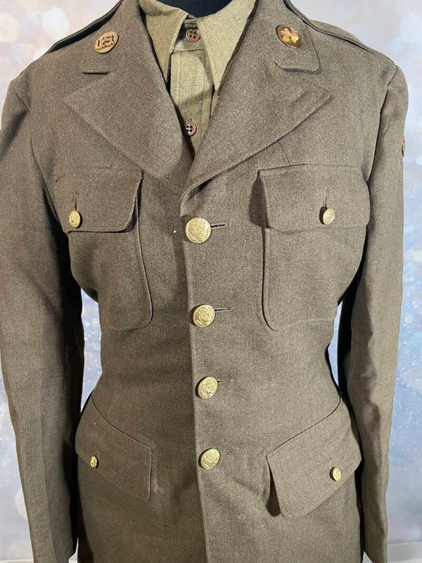 This set is complete with brass “U.S.” and branch collar discs, eagle-embossed buttons, and original WWII tailoring. The wool fabric is well-preserved for its age, with expected light wear but no major damage, making it both collectible and display-ready. Together, the jacket, trousers, shirt, and caps create an authentic representation of a WWII American soldier’s dress uniform, offering a rare opportunity to own a unified grouping rather than individual pieces.