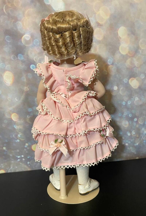 She wears a tiered pink ruffle gown trimmed in lace and accented with embroidered rosebuds, perfectly reflecting the elegance of Shirley Temple’s classic screen appearances. Completing the look are her white socks and Mary Jane shoes, all displayed on a sturdy stand.